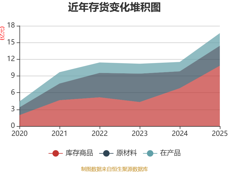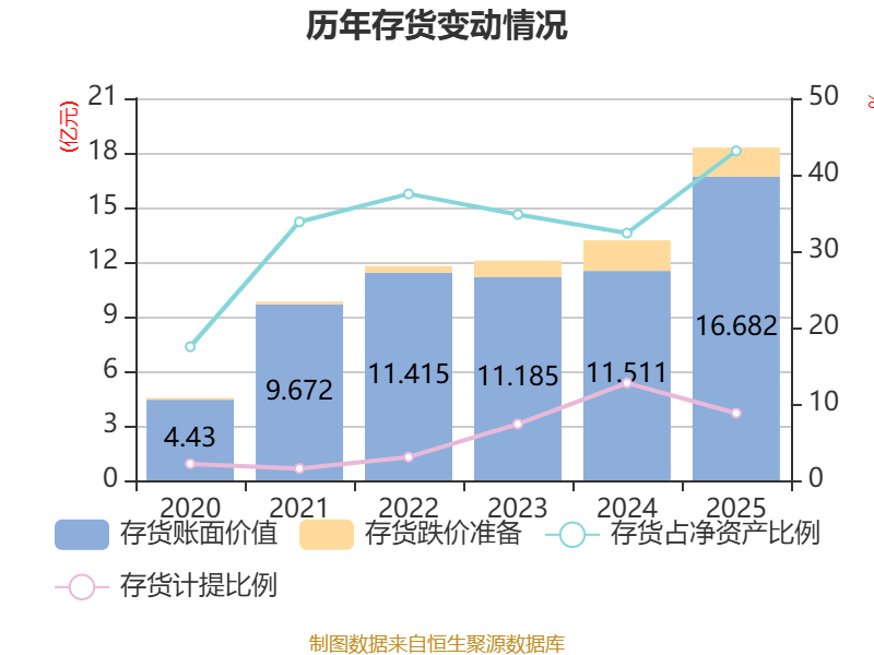 从存货变动来看,限度2025年末,公司存货账面价值为16.68亿元,占净金钱的43.11%,较上年末加多5.17亿元。其中,存货跌价准备为1.61亿元,计提比例为8.79%。