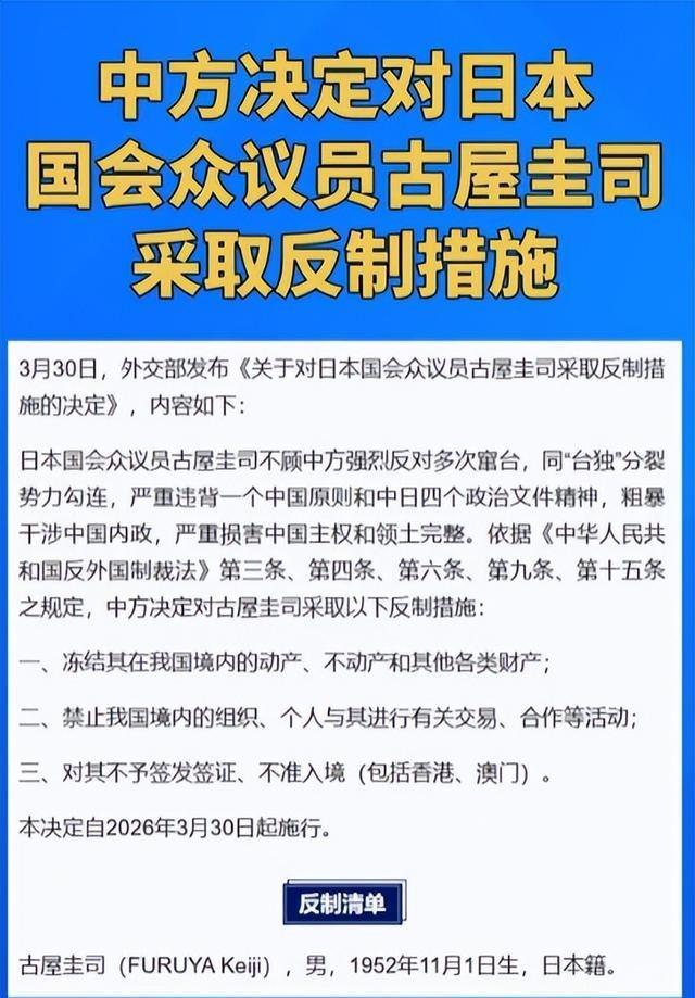 再望望古屋圭司本东说念主。制裁令落地不到二十四小时,他在日本国会濒临媒体撂了三句话——"窜台是理所天然的事。""会实行制裁,不愧是中国。""我几十年没去过中国,在中国也没财产,制裁没影响。"